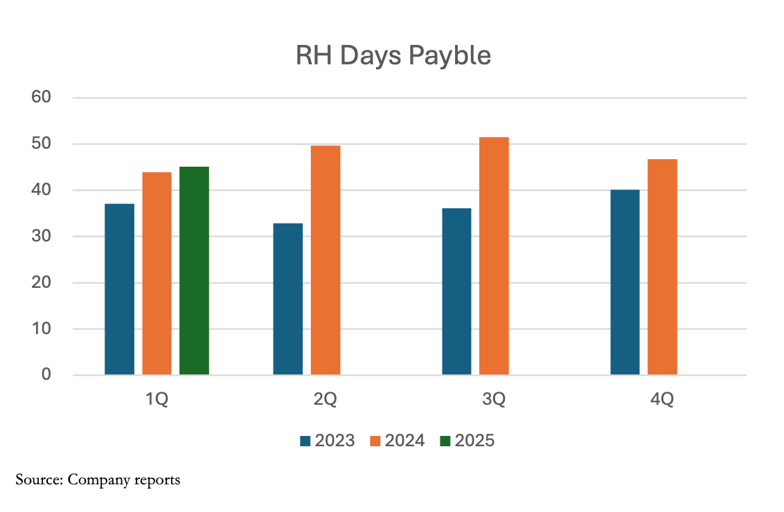 Most recent example of Gary never being straight with shareholders: Back in 3Q24 he said RH would no longer source from China by 2Q25. Mind you this was well before liberation day and retaliatory tariffs. And that’s even despite fact they sourced more from China in 2024 (23%) than 2023 (22%). Silent to the topic in 4Q24 and only now we hear they still did 16% in 1Q25 and should only get to 2% by the end of the year. You can never rely on a single thing he says. Ever. Best part is they expect a “meaningful portion of the tariff absorbed by our vendor partners” when their like for like days payable only continue to increase. I am shocked that despite running a 60% off clearance program since September 2023, increasing the RH Member discount to 30% in mid-March 2025, and introducing a RH Member discount for Outdoor of 35%, days payable only continue to increase.