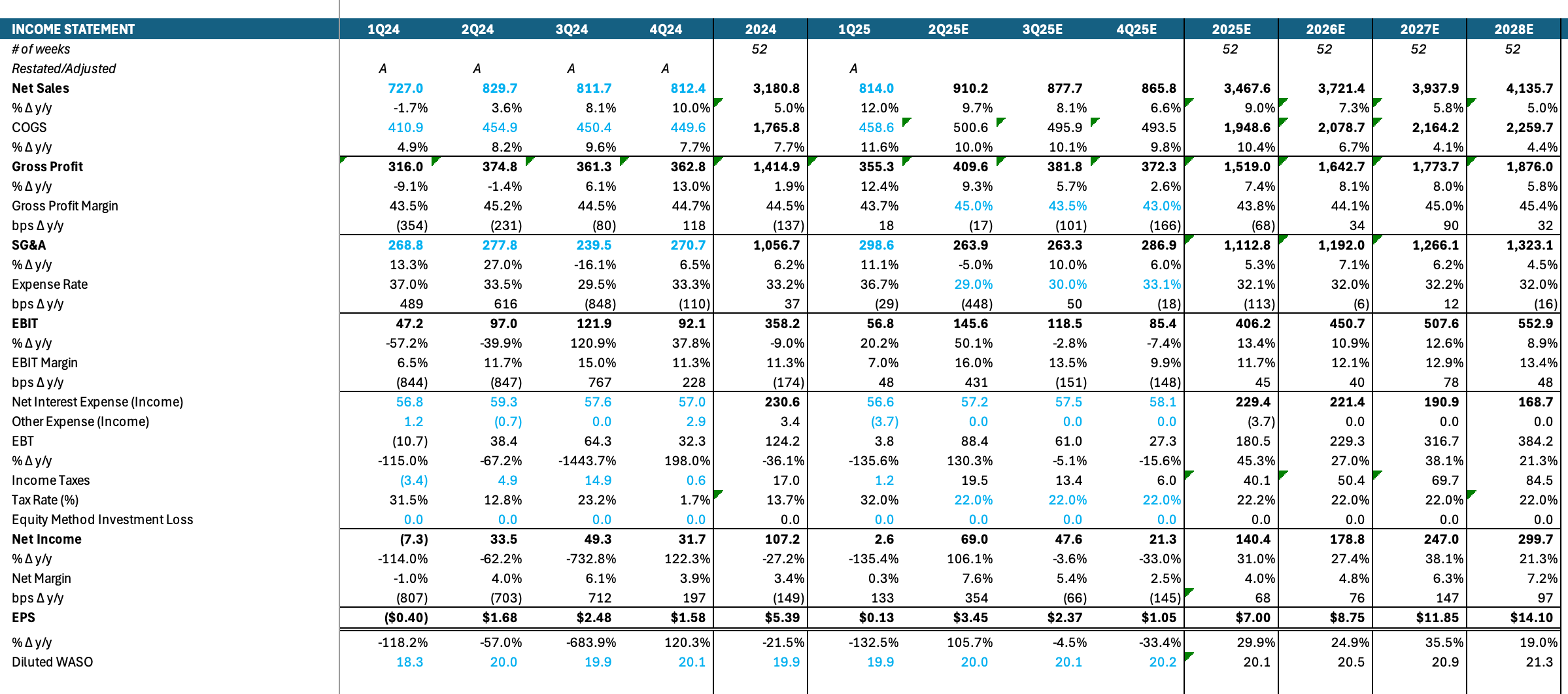 Personally, I am incrementally more negative based off the model. I had them crushing earnings in 1Q25 at $0.20 on even my downside scenario but all they could do is $0.13. What scares me most is all the advertising expense that flowed through 1Q25 should help 2Q25 revenue in a big way but alternative data already says it isn’t, not to mention the massive 600 bps callout to 2Q25 revenue from “tariff” related issues. Not sure how they make any of this up in 2H25, other than square footage expansion. TBC, that is super low quality for total revenue growth or EPS, particularly given inflationary costs towards any new stores. I think Gary was proactively trying to manage this narrative during the call by saying he was looking at an entirely new format for growth that magically is half the cost.